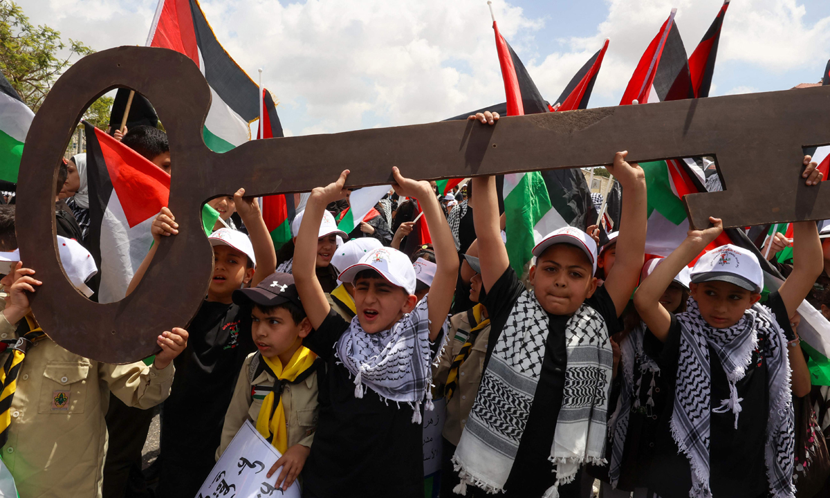 팔레스타인 어린이들이 14일(현지시간) 이스라엘 점령 지역인 서안지구 라말라에서 ‘나크바(대재앙)의 날’ 77주년 집회에 참석해 열쇠 모형을 들어보이고 있다. 1948년 이스라엘 건국 과정에서 팔레스타인인 75만명이 강제 이주된 것을 기억하는 날로, ‘고향으로 돌아갈 권리’를 상징하는 집 열쇠 모형이 나크바 집회의 상징으로 쓰인다.