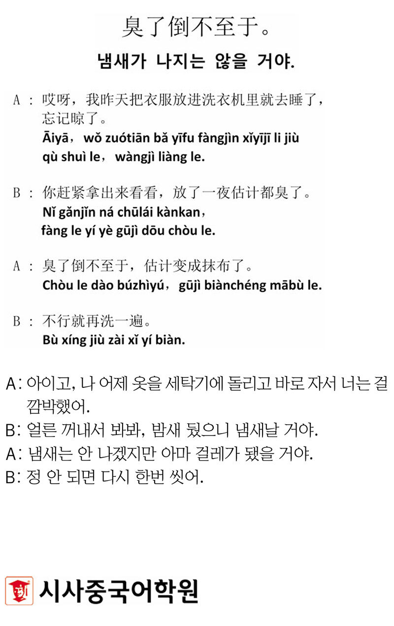 [시사중국어학원의 리얼 중국어 회화] 냄새가 나지는 않을 거야. 입력 : 2025-05-15 18:29:56 수정 : 2025-05-15 18:29:55 구글 네이버 유튜브 Copyright ⓒ 세계일보. 무단 전재 및 재배포 금지 세계일보