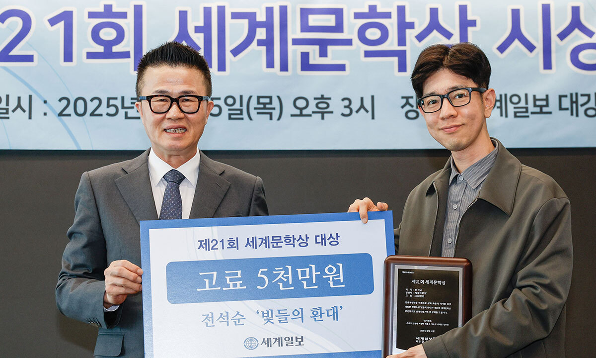 장편소설 ‘빛들의 환대’로 제21회 세계문학상을 받은 전석순(43) 작가의 소감이다. 15일 서울 용산구 세계일보 대강당에서 본사 정희택 사장과 황정미 편집인 등이 참석한 가운데 열린 시상식에서 그는 “세계일보사와 세계문학상 심사위원 선생님들께 깊은 감사의 인사를 드린다. 이 소설에 전해주신 따뜻한 목소리를 잊지 않고 오래 간직하겠다”며 이같이 밝혔다.