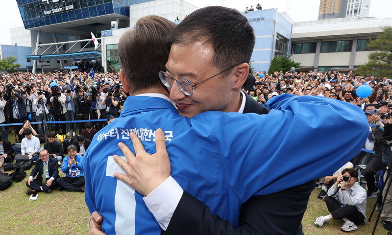 더불어민주당 이재명 대선 후보가 16일 국민의힘을 탈당한 무소속 김상욱 의원을 만나 끌어안았다. 전날 이 후보가 “우리 당에 입당해서 함께 했으면 좋겠다”고 손을 내민 지 하루 만이다.