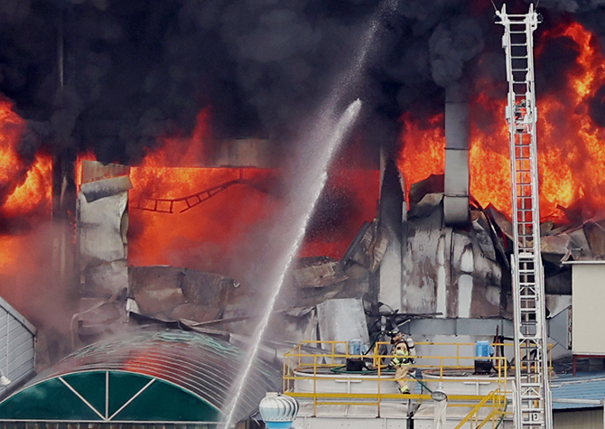 이날 화재로 공장 직원 1명이 골절상 등 중상을 입었고, 소방대원 2명도 화상 등 상처를 입어 치료 중이다.