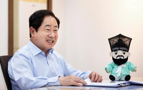 주광덕 경기 남양주시장과 정약용 선생 캐릭터 인형. 남양주시 제공