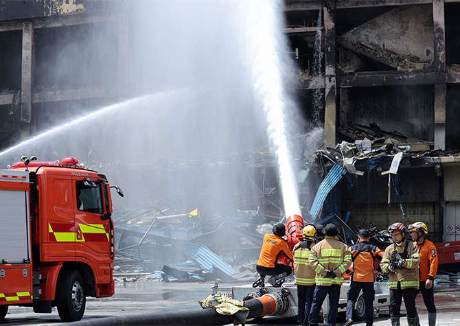 또 일반적으로 물을 뿌려도 불이 잘 꺼지지 않는 생고무의 특성을 고려해 고성능 화학차 18대를 투입해 폼 수용액을 뿌려 산소를 차단하는 등 쉴 새 없이 장비와 인력을 가동하고 있다.