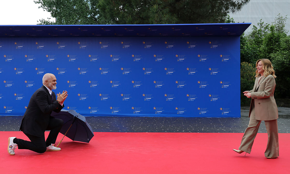 에디 라마 알바니아 총리(왼쪽)가 16일(현지시간) 알바니아 수도 티라나에서 열린 유럽정치공동체(EPC) 정상회의에서 우산을 내려놓고 한쪽 무릎을 꿇은 채 조르자 멜로니 이탈리아 총리를 맞이하고 있다. 농구 선수 출신인 라마 총리의 키는 200.6㎝로 157.5㎝인 멜로니 총리와 키를 맞추기 위해 무릎을 꿇은 것으로 알려졌다. 이탈리아는 알바니아의 유럽연합(EU) 가입을 지지하는 등 양국은 돈독한 관계를 유지하고 있다.