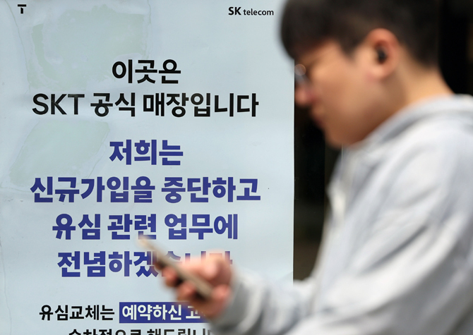 지난 18일 서울시내의 한 SK텔레콤(SKT) 매장에 해킹 사태 관련 안내문이 게시돼 있다. 이날 SKT는 사이버 침해 사고 관련 고객 보호 조치의 하나로 디지털 취약계층을 위한 '찾아가는 서비스'를 오는 19일부터 시행한다고 밝혔다. 뉴스1