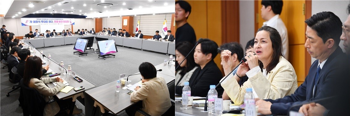 부산시가 지난 16일 부산시청 영상회의실에서 개최한 ‘2025 전국(장애인)체육대회 개·폐회식’ 연출 비전 발표회(왼쪽)에서 박칼린 총감독(오른쪽)이 개·폐회식에 대해 설명하고 있다. 부산시 제공