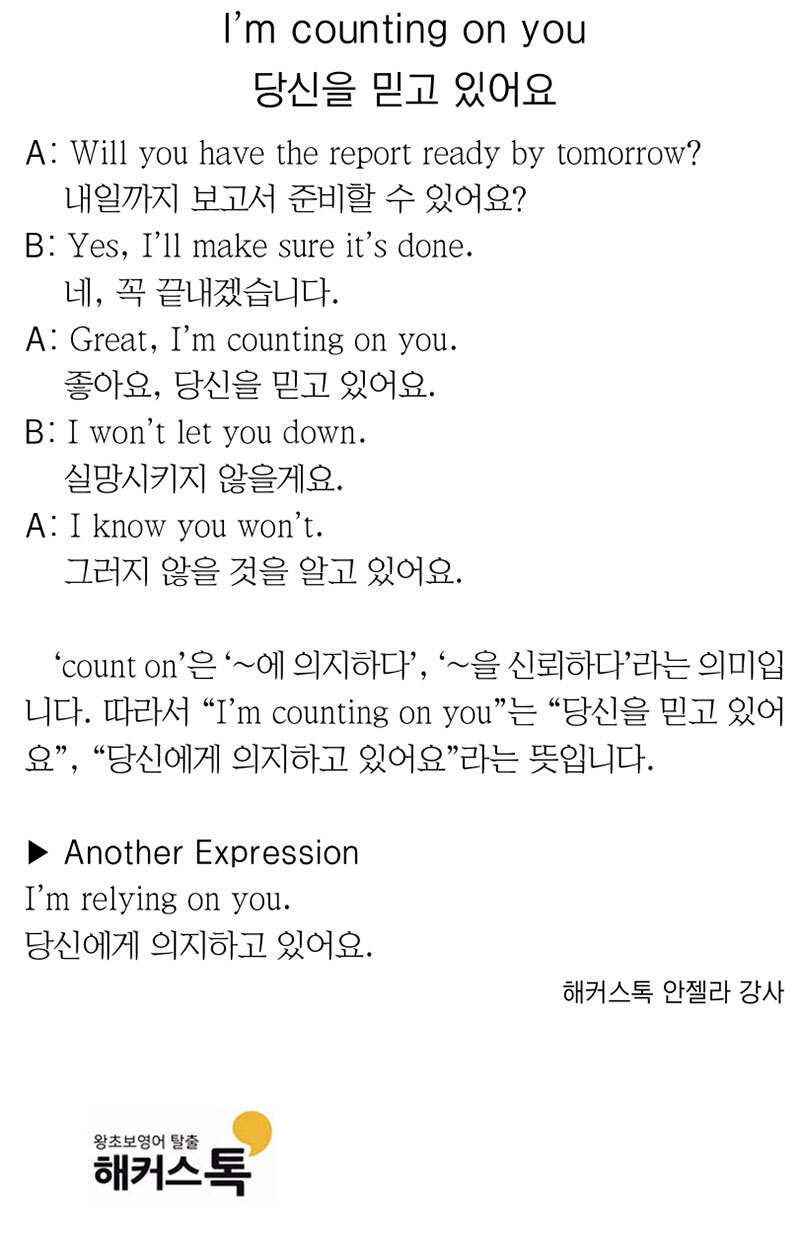 [해커스톡 일대일 영어회화] 하루 1분 기초 영어회화 말하기 (5월 20일) 입력 : 2025-05-20 09:00:00 수정 : 2025-05-19 18:20:58 구글 네이버 유튜브 I'm counting on you 당신을 믿고 있어요 Copyright ⓒ 세계일보. 무단 전재 및 재배포 금지 세계일보