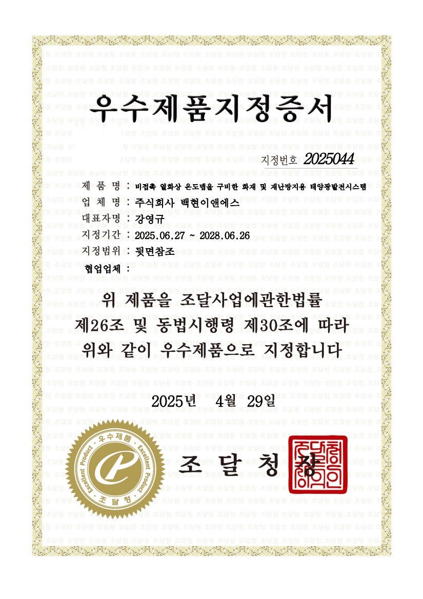 태양광에너지 전문기업 ㈜백현이앤에스는 열분포 화재 감지와 차단기술을 활용한 ‘비접촉 열화상 온도맵을 구비한 화재 및 재난방지용 태양광 발전시스템’이 2025년도 제1차 조달청 우수제품으로 공식 지정됐다고 19일 밝혔다.
