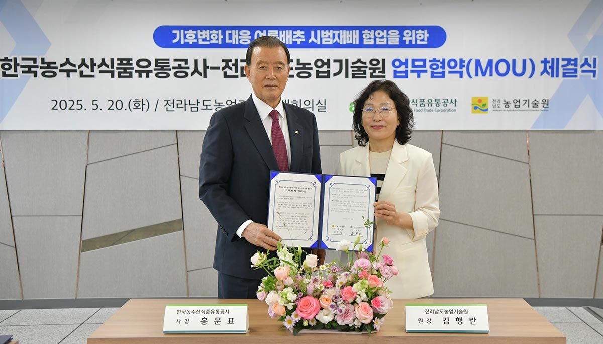 한국농수산식품유통공사(aT·사장 홍문표)와 전라남도농업기술원(원장 김행란)은 20일 전남 나주 전라남도농업기술원에서 기후변화 대응을 위한 초여름배추 시범재배 협업 업무협약을 체결했다.