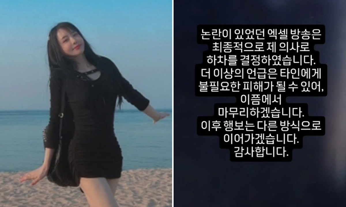 서유리는 20일 인스타그램에 "논란이 있었던 엑셀 방송은 최종적으로 제 의사로 하차를 결정했습니다, 더 이상의 언급은 타인에게 불필요한 피해가 될 수 있어 이쯤에서 마무리하겠습니다, 이후 행보는 다른 방식으로 이어가겠습니다"라는 글을 올렸다.