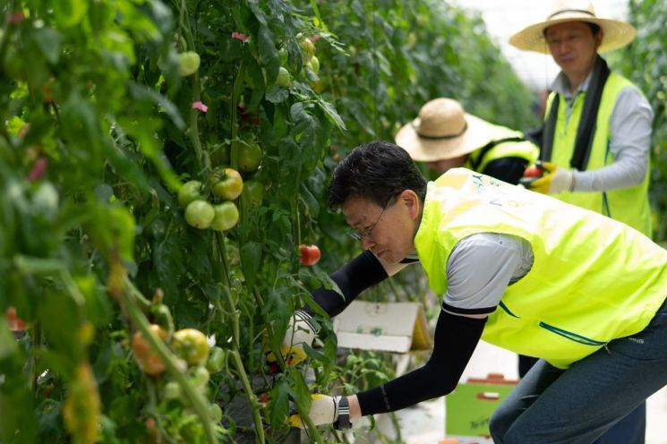 강태영 NH농협은행장이 21일 경기 광주시의 한 토마토 농가를 찾아 농번기 일손을 도왔다고 NH농협은행이 전했다.
