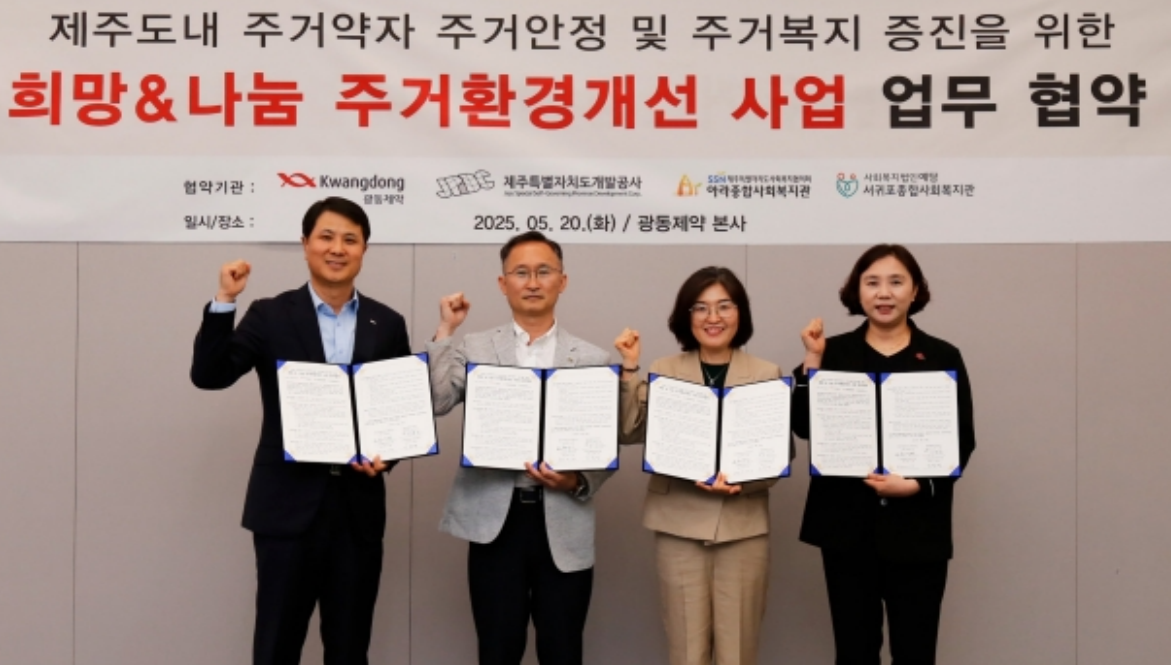 최성원 광동제약 대표이사는 “제주 지역사회와의 연대는 광동제약이 추구하는 지속가능경영의 핵심 가치”라며, “앞으로도 제주개발공사와 함께 주거환경 개선 등 제주를 위한 사회공헌 활동을 지속적으로 확대해 나가겠다”고 말했다.
