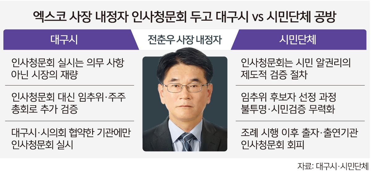 지역 시민단체는 엑스코 사장 내정자에 대한 인사청문회를 요구하고 나섰다. 일부 단체는 엑스코 임추위에 대한 대구시의 감사를 촉구하는 성명서를 내며 강력히 반발했다. 우리복지시민연합은 성명서에서 “전 내정자는 감사원 지적을 받고도 퇴직한 지 두 달도 채 안 돼 엑스코 사장으로 내정됐다”며 “대구시의회는 사장 내정자 인사청문회를 반드시 시행하고, 시는 바로 인사청문회를 요청하라”고 촉구했다. 시의회도 전 내정자에 대한 인사청문회를 대구시에 요청할 방침이다. 반면 대구시는 인사청문회 요구와 관련해 “지방공사·공단 및 출연기관의 기관장은 시장이 임명하는 반면 출자기관인 엑스코 사장은 엑스코 주주총회에서 임명하는 것으로 인사청문회 실시는 부적절하다”고 반박했다.