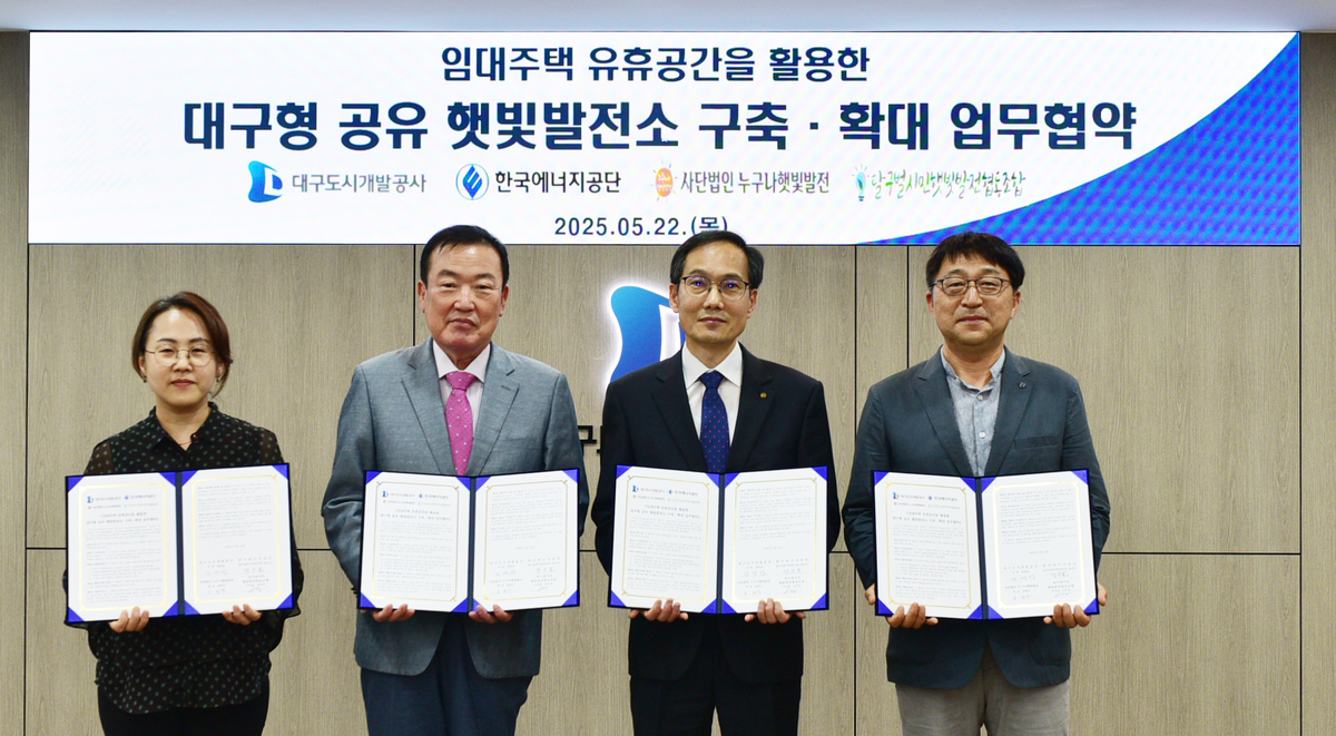 대구도시개발공사는 한국에너지공단 대구경북본부, 누구나햇빛발전, 달구벌시민햇빛발전협동조합 등과 대구형 공유햇빛발전소 구축 및 확대를 주된 내용으로 한 협약을 했다고 26일 밝혔다.
