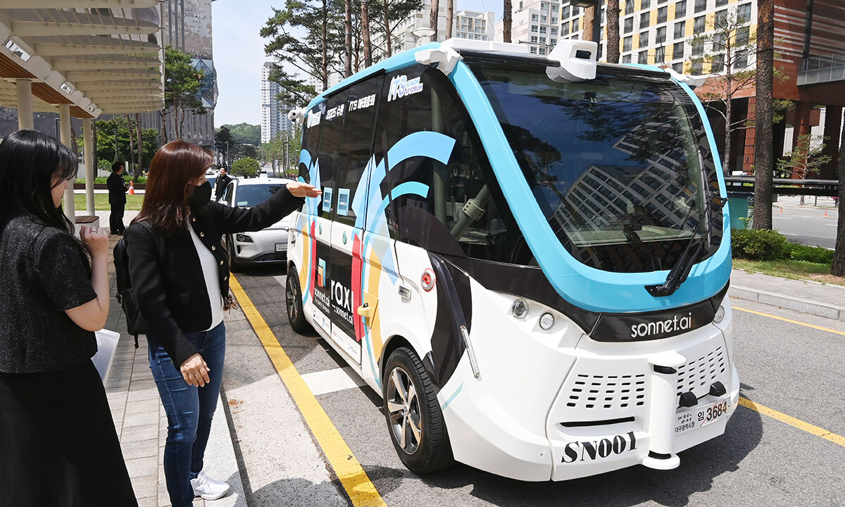 ‘2025 수원 지능형교통체계(ITS) 아태총회’를 이틀 앞둔 26일 경기 수원시 영통구 광교일대에서 자율주행차량이 시운전을 하고 있다. 자율주행차량은 행사가 열리는 28일부터 30일까지 수원컨벤션센터, 광교중앙역, 홍재교삼거리, 센트럴파크로사거리에 이르는 3.2㎞ 노선을 차량 5대가 오전 9시30분부터 11시30분, 오후 1시30분부터 4시까지 30분 단위로 운행한다.