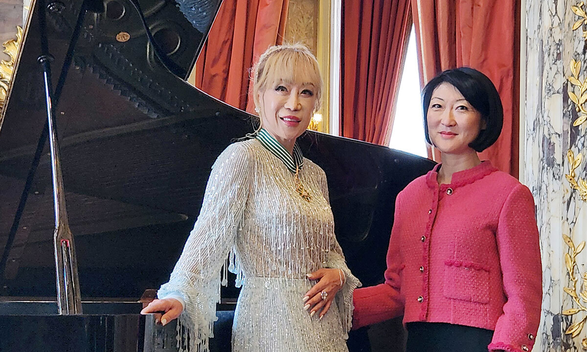세계적 소프라노 조수미(왼쪽)가 26일(현지시간) 프랑스 파리 오페라 코미크 극장에서 한국계 프랑스인인 플뢰르 펠르랭 전 문화장관에게 프랑스 최고 문화훈장인 코망되르(예술문예훈장)를 수여받은 뒤 기념사진을 촬영하고 있다. 한국인이 코망되르 훈장을 받은 것은 2002년 김정옥 당시 한국문화예술진흥원장과 2011년 지휘자 정명훈에 이어 3번째다.