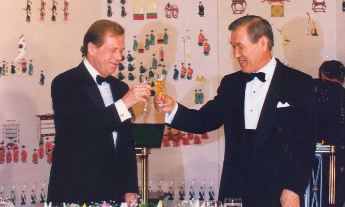 1992년 4월 방한한 바츨라프 하벨 체코 대통령(왼쪽)이 청와대에서 열린 환영 만찬 도중 노태우 대통령과 건배하고 있다. 하벨은 임기 중 한국·체코 수교를 이뤄낸 데 이어 퇴임 이후인 2004년에는 서울평화상을 받는 등 한국과 인연이 깊다. 세계일보 자료사진