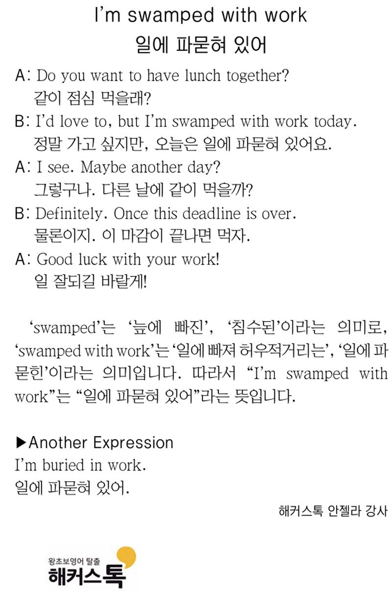 [해커스톡 일대일 영어회화] 하루 1분 기초 영어회화 말하기 (5월 28일) 입력 : 2025-05-28 09:00:00 수정 : 2025-05-27 18:22:51 구글 네이버 유튜브 I'm swamped with work 일에 파묻혀 있어 Copyright ⓒ 세계일보. 무단 전재 및 재배포 금지 세계일보