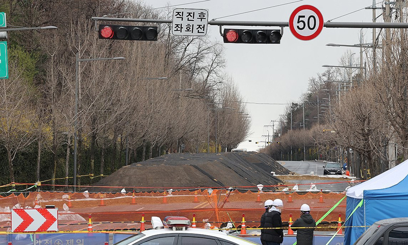 지난 3월 30일 싱크홀(땅 꺼짐) 사고가 발생한 서울 강동구 대명초등학교 인근 사거리에 시민들의 출입을 막는 안전펜스가 설치돼있다. 연합뉴스