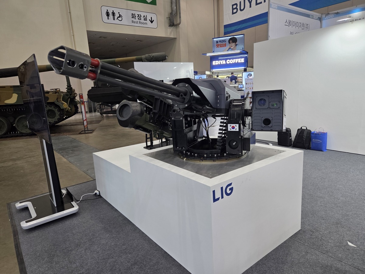 LIG넥스원 부스에는 무인수상정(USV)의 주무장 으로 장착하는 ‘3포열 20㎜ RCWS(Remote Controlled Weapon System, 원격사격통제체계)’를 선보인다.