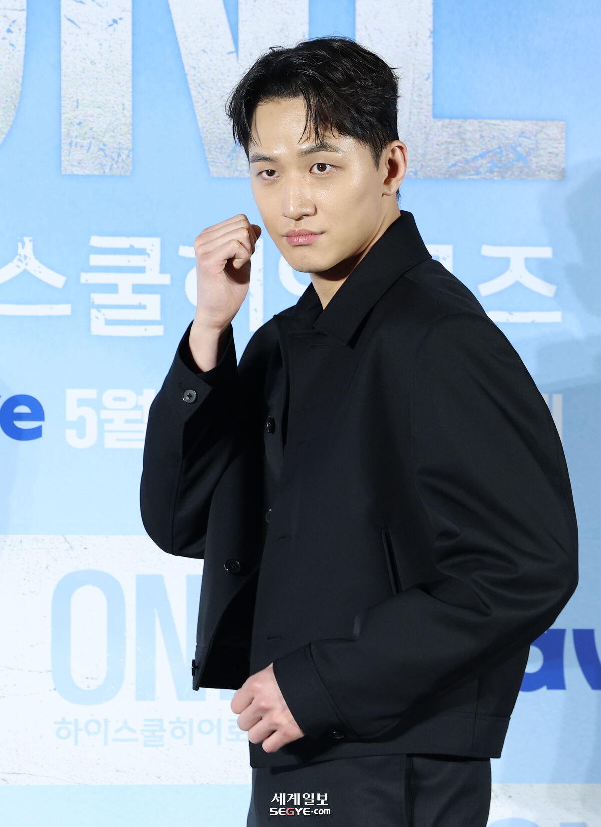 배우 유희제가 28일 서울 광진구 건대입구 롯데시네마에서 열린 웨이브 새 드라마 'ONE : 하이스쿨 히어로즈' 제작발표회에 참석해 포즈를 취하고 있다.