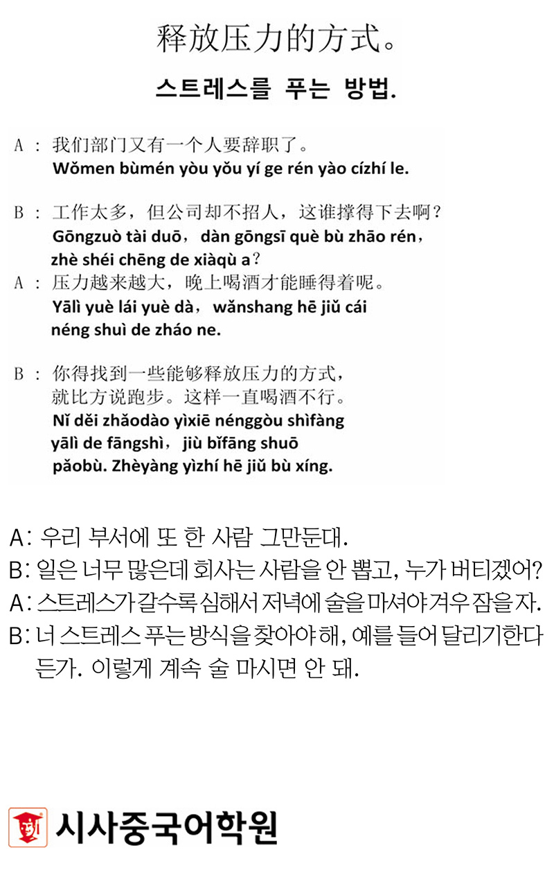 [시사중국어학원의 리얼 중국어 회화] 스트레스를 푸는 방법. 입력 : 2025-05-28 18:13:40 수정 : 2025-05-28 18:13:37 구글 네이버 유튜브 Copyright ⓒ 세계일보. 무단 전재 및 재배포 금지 세계일보