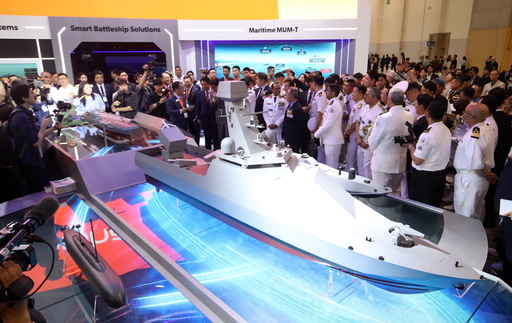 28일 부산 해운대구 벡스코에서 개막한 ‘2025 국제해양방위산업전’(MADEX)에서 참가자들이 한화그룹 부스를 찾아 차세대 무인전투지휘통제함 등을 살펴보고 있다. 31일까지 계속되는 제14회 MADEX는 최근 K방산의 호조세에 힘입어 지난 회차 대비 24% 확대된 14개국 200여개 방산업체가 700여개 부스로 참가한다.