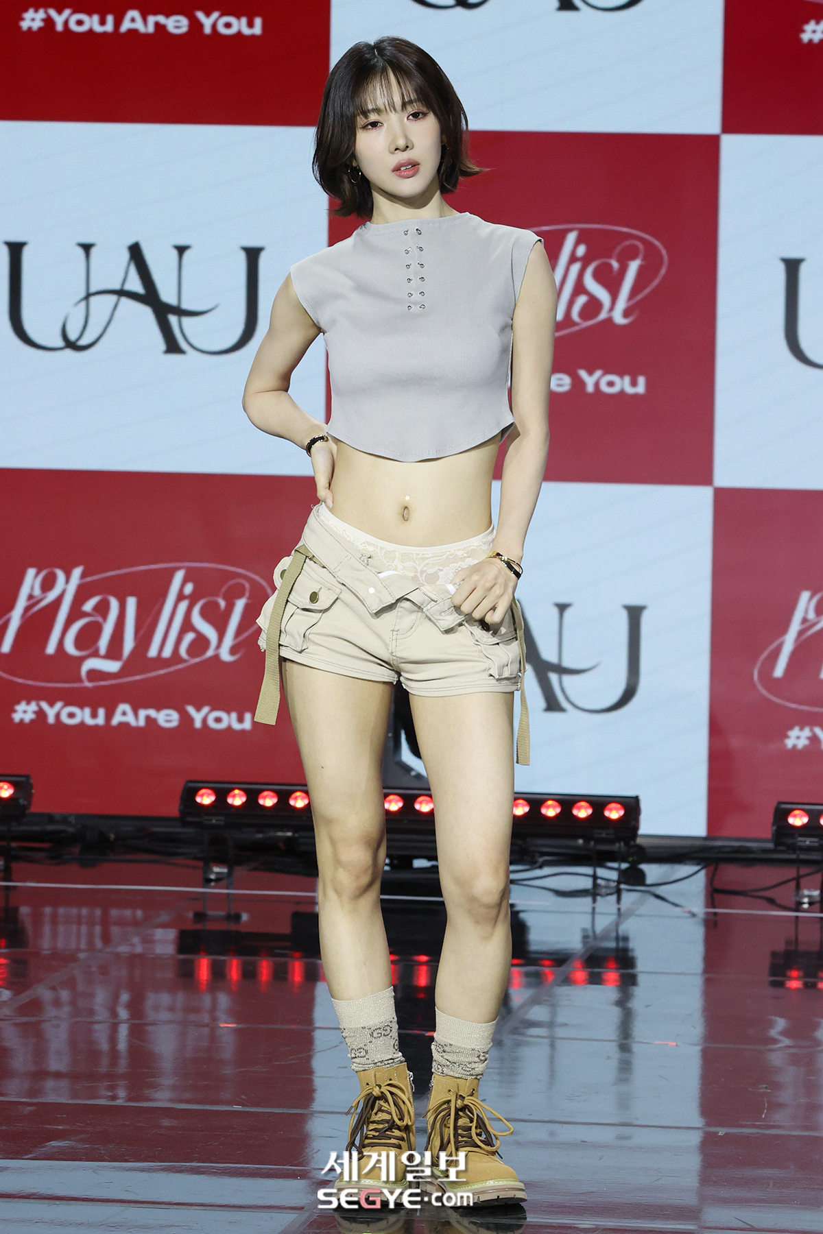 그룹 드림캐쳐가의 유닛 유아유(UAU) 유현이 28일 서울 강남구 청담동 일지아트홀에서 열린 첫 번째 미니앨범 ‘Playlist #You Are You(플레이리스트 #유 아 유)’의 쇼케이스에 참석해 포즈를 취하고 있다.