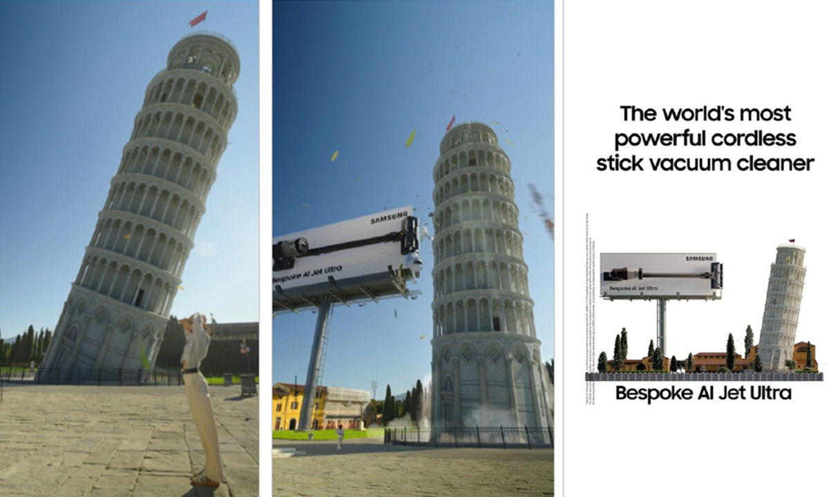 삼성전자는 ‘비스포크 인공지능(AI)’ 가전을 소재로 한 이색 광고가 세계인의 눈길을 끌고 있다고 28일 밝혔다. 현실 배경에 초현실적인 가상그래픽을 입혀 제품의 특장점을 위트 있게 연출한 7편의 영상 시리즈다. 사진은 무선 스틱청소기 기준 세계 최고 흡입력(400W)을 갖춘 ‘비스포크 AI 제트 400W’가 큰 바람을 일으켜 기울어진 피사의 사탑을 수직으로 곧게 세우는 장면이다.