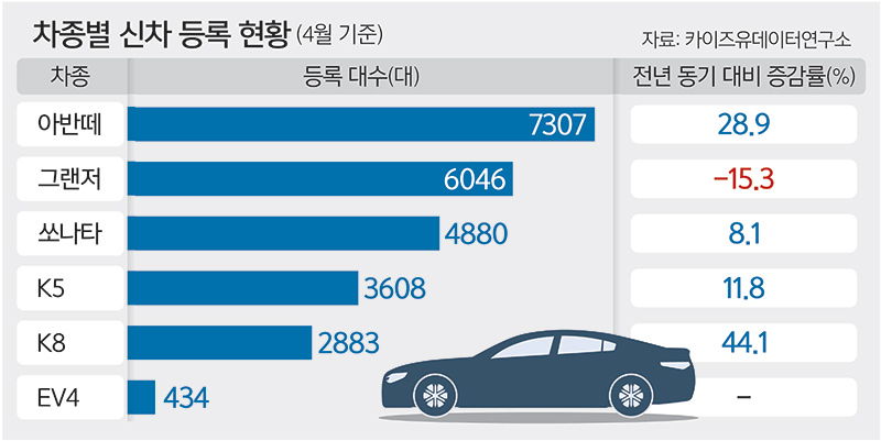 4월 등록된 차량 기준으로 현대차 아반떼는 7307대가 등록돼 1년 전에 비해 28.9% 증가했다. 아반떼는 4월 기아 쏘렌토와 카니발에 이어 세 번째로 많이 팔린 차종에 오르기도 했다. 6위에 오른 현대차 그랜저는 6046대로 주요 세단 중 유일하게 전년 대비 판매량이 감소(15.3%)했다. 연식 변경을 앞두고 있어 신차를 기다리는 수요가 반영됐기 때문으로 해석된다.