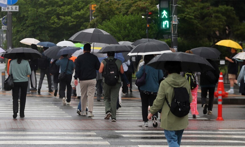 지난 15일 서울 종로구 광화문 네거리에 우산을 쓴 시민들이 발걸음을 재촉하고 있다. 뉴시스