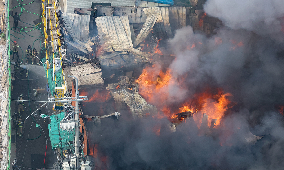 28일 노후된 상가 건물이 밀집한 서울 중구 산림동 재개발 구역 한 건물에서 시작된 화재로 화염과 검은 연기가 하늘로 솟구치고 있다. 소방당국은 한때 대응 2단계를 발령하고 차량 100대와 포클레인 5대, 인력 446명을 투입해 진화에 나섰고 이날 오후 8시20분쯤 화재 발생 약 5시간 만에 초진을 선언했다. 이번 불로 을지로 4가에서 3가 방향 차로가 전면 통제됐고 인근 상인과 행인들이 대피한 가운데, 70대 남성 1명이 연기를 흡입해 병원으로 이송됐다. 불이 난 건물에는 74개 점포가 영업 중이었는데, 48개 점포가 소실됐다. 건물 대부분 공간이 창고로 사용되면서 다량의 가연물이 내부에 있었던 것으로 파악됐다.