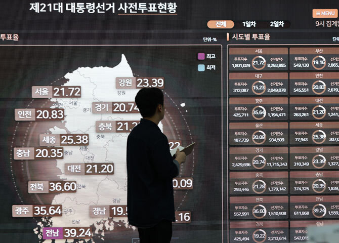 제21대 대통령선거 사전투표 둘째날인 30일 오전 10시 전국 누적 투표율이 23.33%로 집계됐다. 지난 20대 대선과 비교해 1.71%포인트 높은 역대 최고치다.