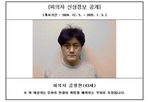 대전지검 서산지청은 신상정보 공개심의위원회를 열어 범행의 잔인성과 피해의 중대성, 공공의 이익, 피해자 유족이 신상정보 공개를 요청한 점 등을 고려해 김명현의 신상정보를 공개했다.
