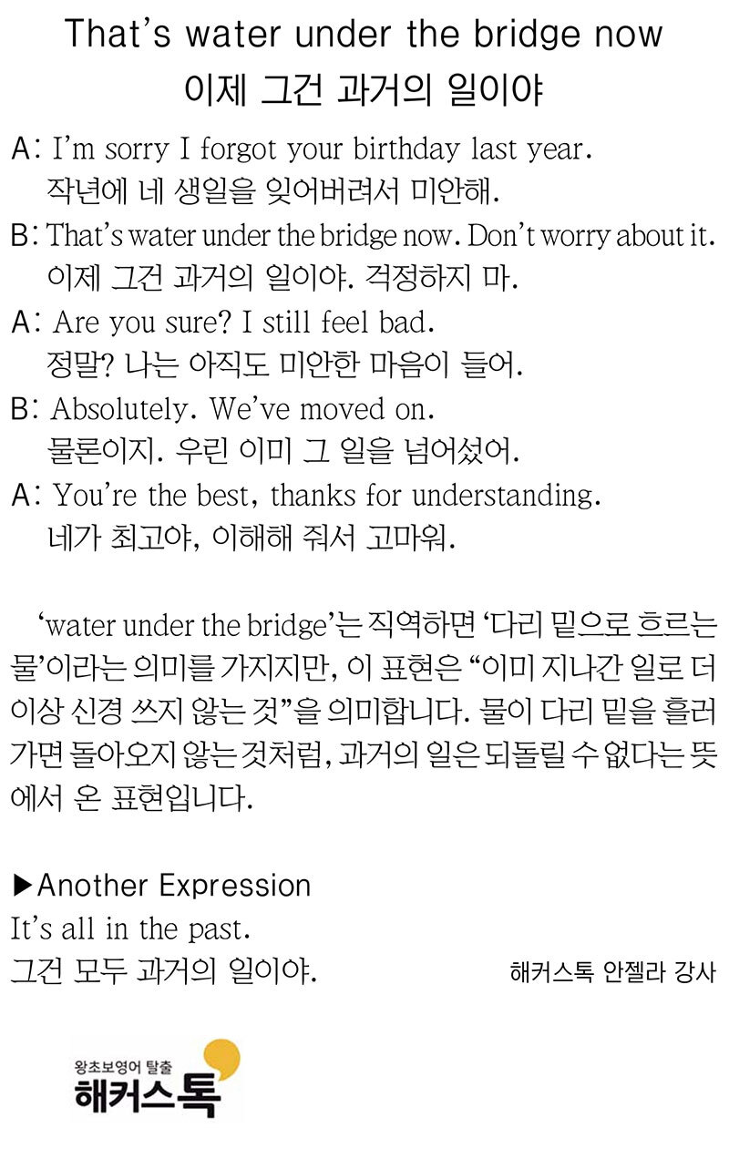 [해커스톡 일대일 영어회화] 하루 1분 기초 영어회화 말하기 (6월 2일) 입력 : 2025-06-02 09:00:00 수정 : 2025-06-01 18:13:22 구글 네이버 유튜브 That's water under the bridge now 이제 그건 과거의 일이야 Copyright ⓒ 세계일보. 무단 전재 및 재배포 금지 세계일보