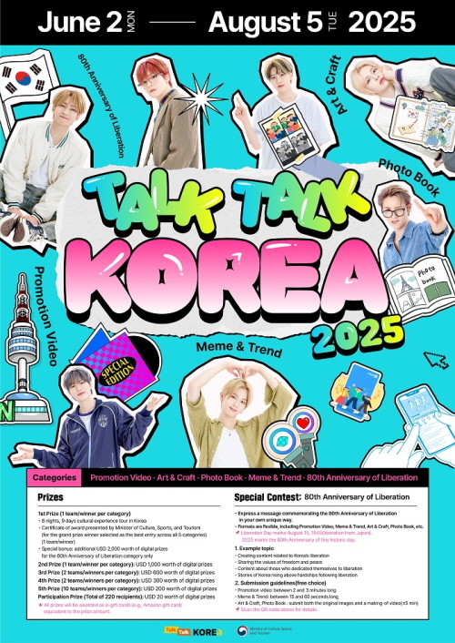 문화체육관광부(장관 유인촌, 이하 문체부)가 6월 2일부터 8월 5일까지 전 세계인을 대상으로 국제 콘텐츠 공모전 ‘토크토크코리아(Talk Talk Korea) 2025’를 개최한다고 밝혔다.