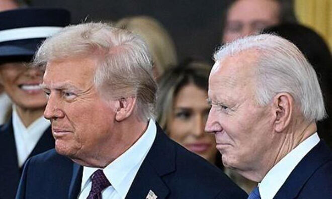 지난 1월 20일 제47대 미국 대통령 취임식에서 나란히 선 도널드 트럼프(왼쪽) 대통령과 조 바이든 전 대통령. 로이터연합뉴스
