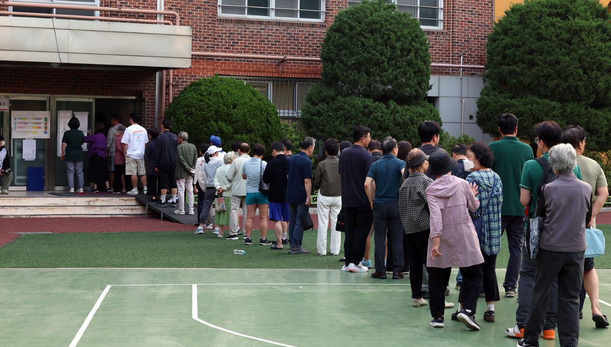(울산=연합뉴스) 김용태 기자 = 제21대 대통령 선거일인 3일 울산시 남구 신정중학교 체육관에 마련된 옥동 제3투표소에서 유권자들이 투표하고 있다. 2025.6.3 yongtae@yna.co.kr