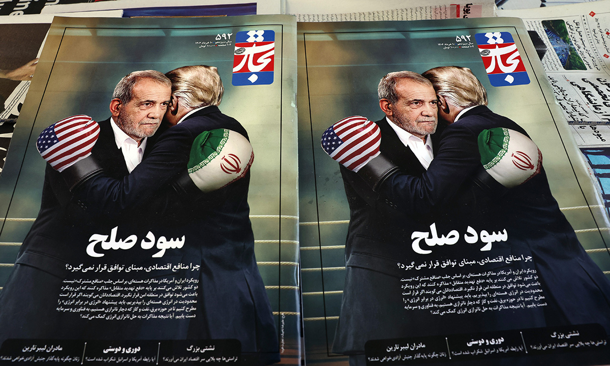 3일(현지시간) 이란 수도 테헤란의 한 가판대에서 마수드 페제시키안 이란 대통령(왼쪽)과 도널드 트럼프 미국 대통령이 복싱 글러브를 착용한 채 포옹하는 사진을 표지로 한 잡지가 진열돼 있다. 양측은 제재 완화와 핵무기 개발 중단을 교환하는 협상을 진행 중이다. 트럼프 대통령이 이란의 우라늄 농축을 허용하지 않을 것이라고 밝힌 데 이어 페제슈키안 대통령은 이날 “평화적 우라늄 농축 권리를 포기하지 않을 것”이라고 목소리를 높였다.