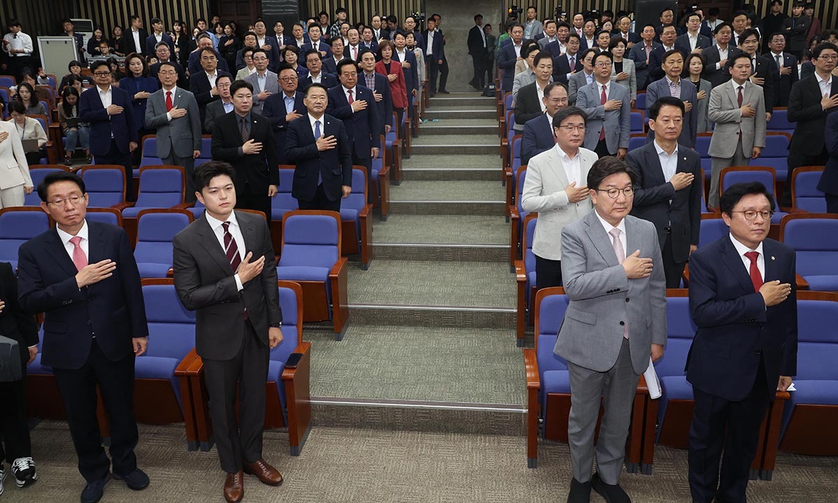 김용태 국민의힘 비상대책위원장과 권성동 전 원내대표를 비롯한 의원들이 5일 서울 여의도 국회에서 열린 의원총회에서 국민의례를 하고 있다.