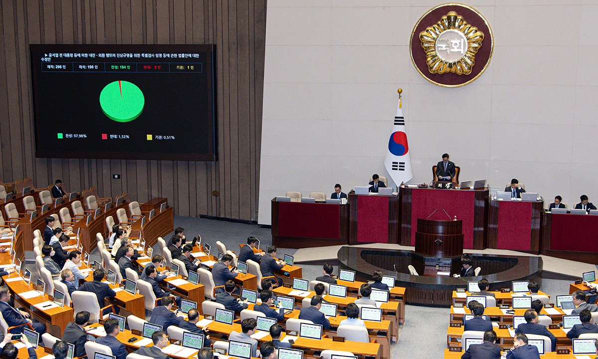 찬성 194표 내란특검법 가결 5일 서울 여의도 국회에서 열린 본회의에서 내란특검법(윤석열 전 대통령 등에 의한 내란·외환 행위의 진상 규명을 위한 특별검사 임명 등에 관한 법률안)이 통과되고 있다. 내란특검법은 찬성 194표, 반대 3표, 기권 1표로 가결됐다. 뉴스1