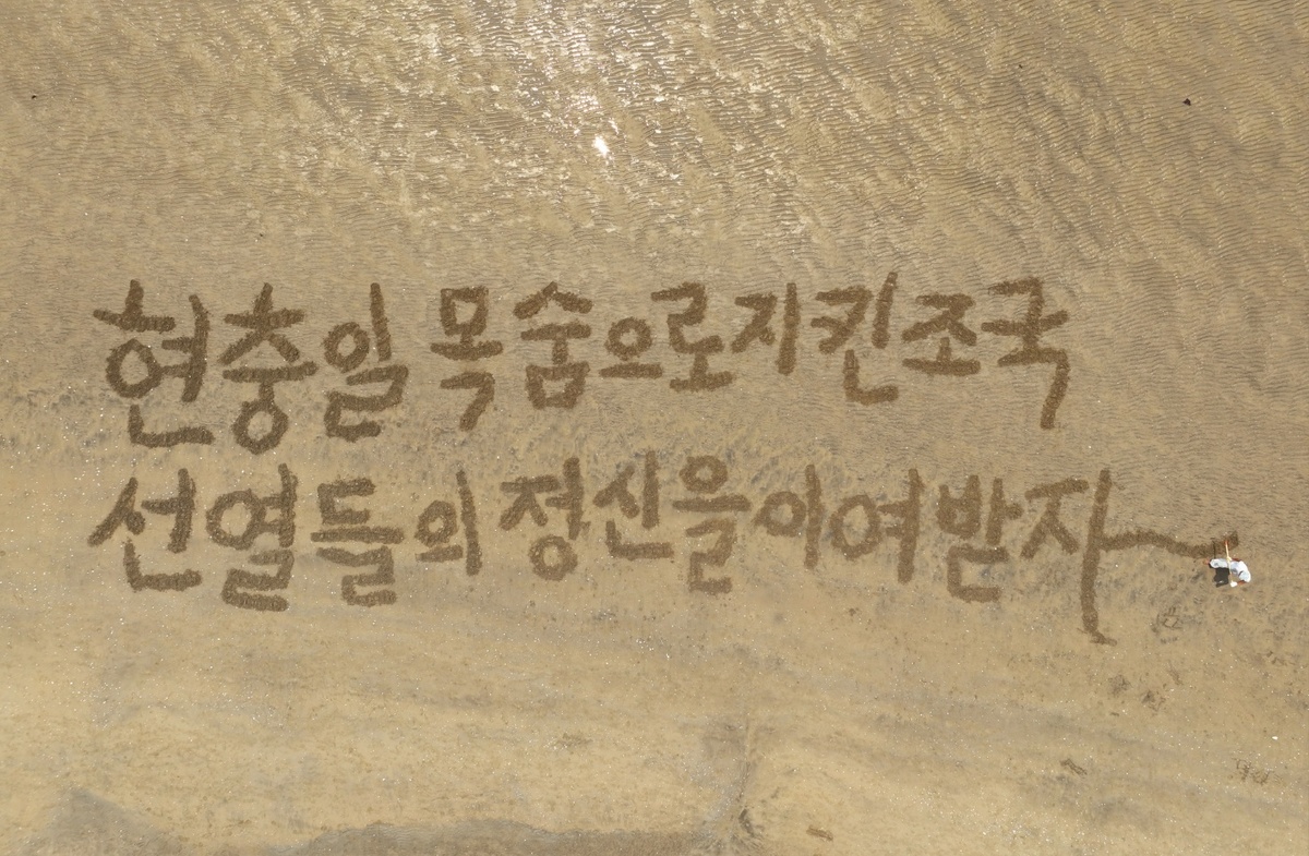 서예퍼포먼스 대가로 알려진 쌍산(雙山) 김동욱 서예가는 현충일을 앞둔 5일 오전 포항 송도해변에서 현충일 기념 행사를 마련했다.