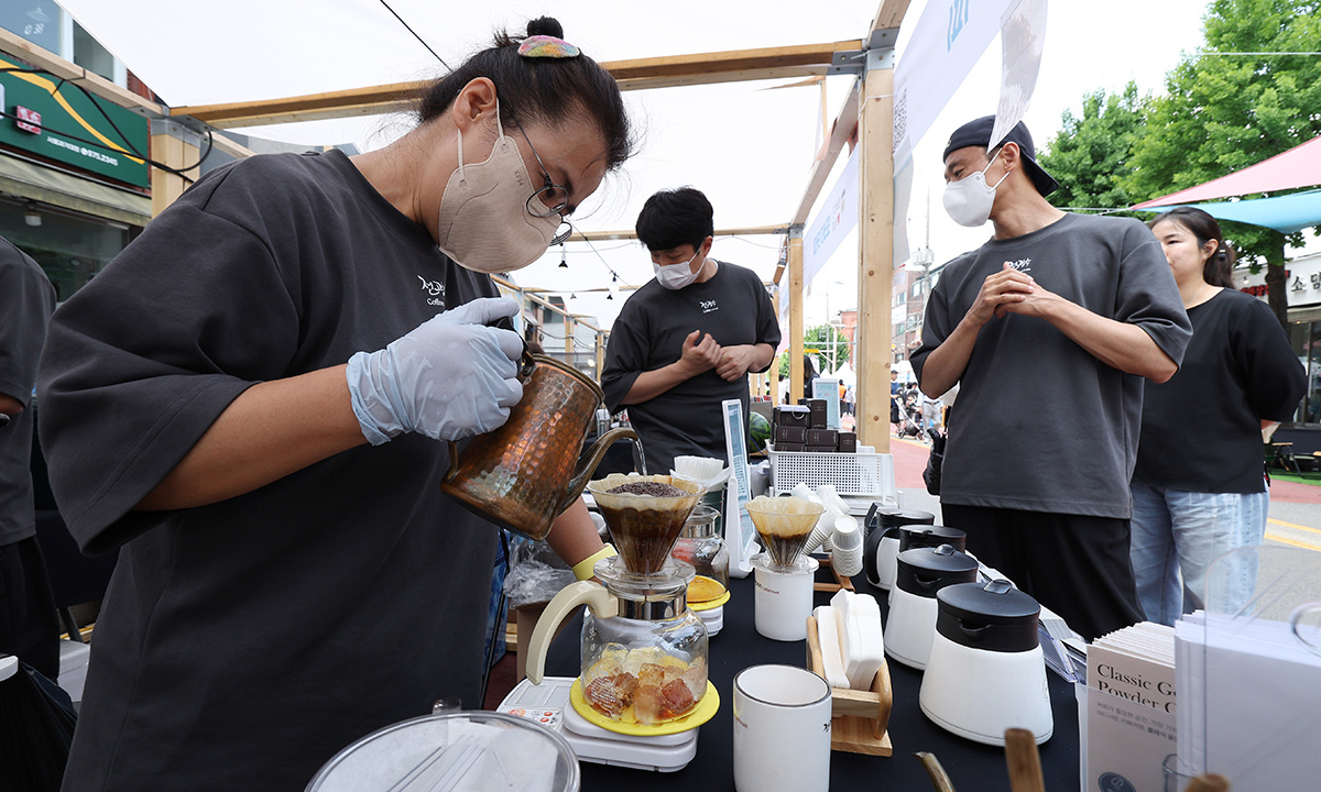 8일 서울 노원구 지하철 공릉역 및 경춘선숲길 일대에서 열린 ‘제3회 경춘선 공릉숲길 커피축제’에 참여한 한 바리스타가 커피를 내리고 있다.