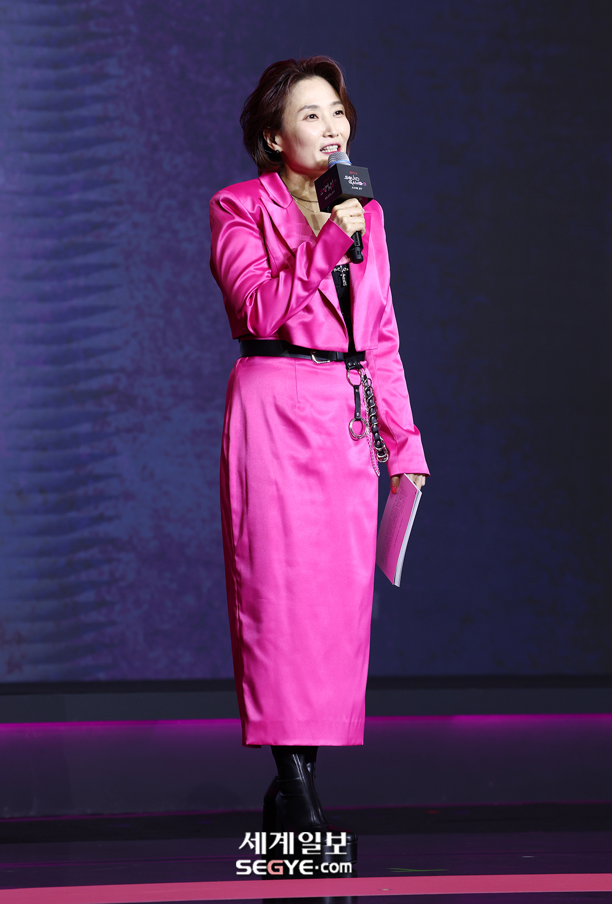 방송인 박경림이 9일 서울드래곤시티 호텔에서 열린 넷플릭스 ’오징어게임3’ 제작발표회에 참석해 인사말을 하고 있다.