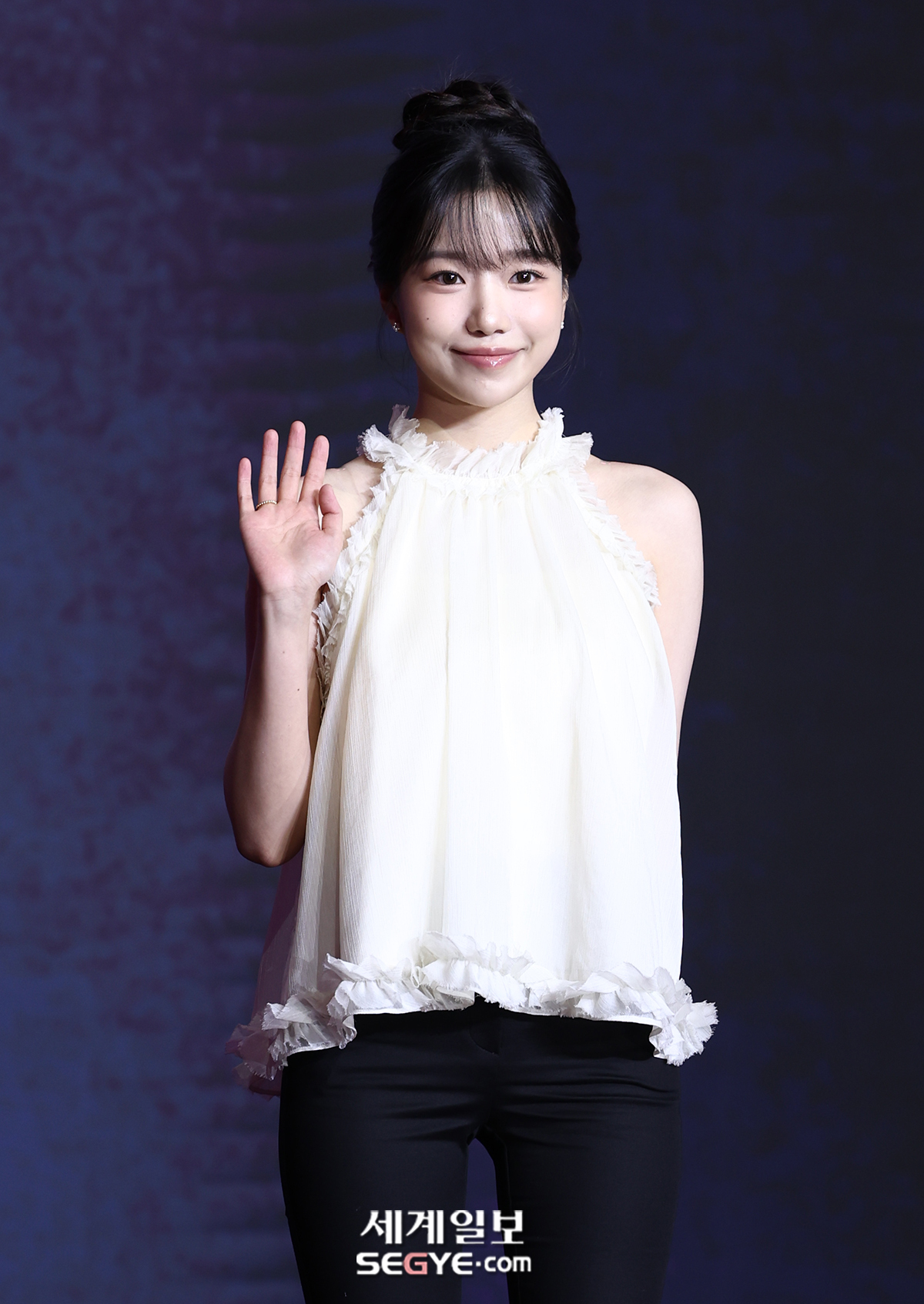 배우 조유리가 9일 서울드래곤시티 호텔에서 열린 넷플릭스 ’오징어게임3’ 제작발표회에 참석해 포즈를 취하고 있다.