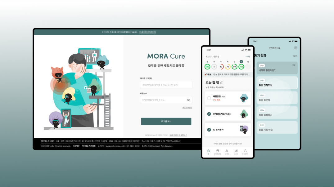 모라 큐어는 재활운동치료와 인지행동치료가 병합된 다학제적 디지털 치료기기다. 질환에 특화된 운동치료와 통증 관리를 위한 인지행동치료를 집합적으로 제공해 치료 순응도와 장기 치료효과를 높인 것이 특징이다.