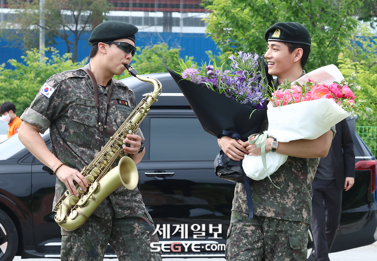 [포토] BTS 뷔-RM '전역 셀프 축하 공연' 입력 : 2025-06-10 09:36:35 수정 : 2025-06-10 09:38:12 춘천=한윤종 기자 hyj0709@segye.com 구글 네이버 유튜브 육군 현역 복무를 마치고 만기 전역한 그룹 방탄소년단(BTS) RM(사진 왼쪽)과 뷔가 10일 강원 춘천시 신북읍체육공원에서 취재진을 향해 색소폰 연주를 하고 있다. 한윤종 기자 Copyright ⓒ 세계일보. 무단 전재 및 재배포 금지 Cube 한윤종