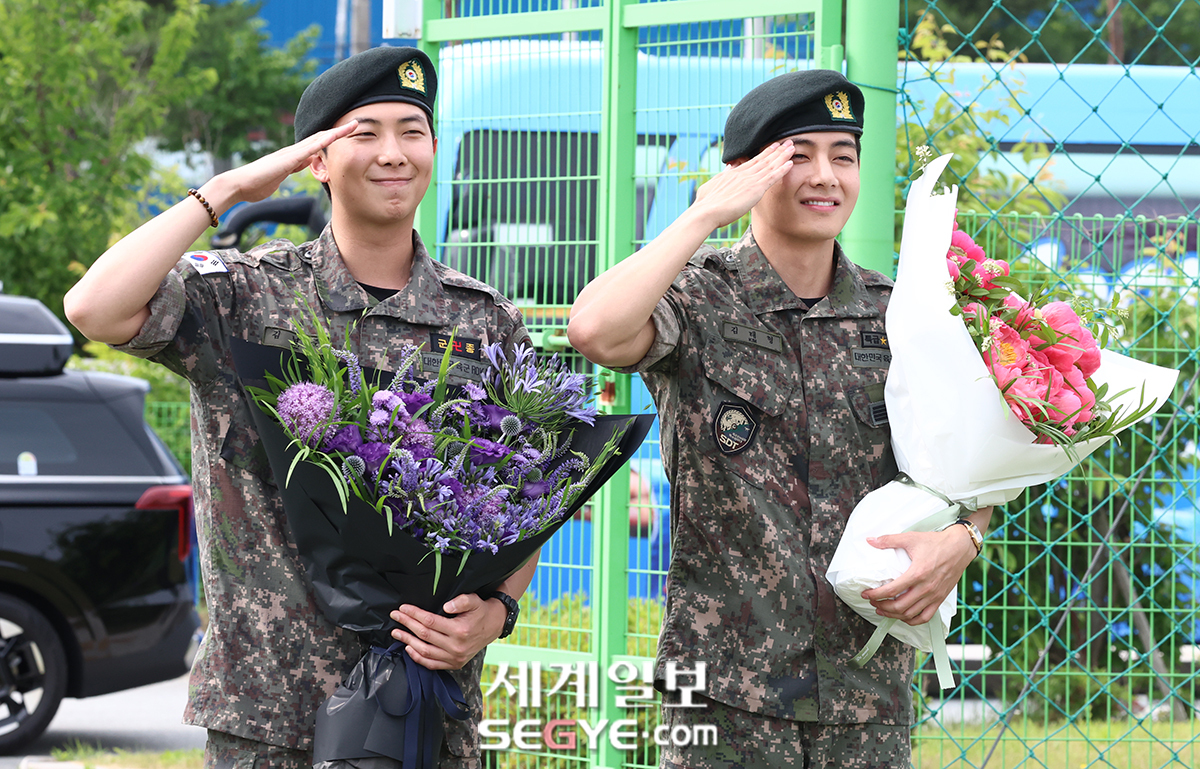 [포토] BTS RM-뷔 '행복한 미소' 입력 : 2025-06-10 09:43:53 수정 : 2025-06-10 09:43:53 춘천=한윤종 기자 hyj0709@segye.com 구글 네이버 유튜브 육군 현역 복무를 마치고 만기 전역한 그룹 방탄소년단(BTS) RM(사진 왼쪽)과 뷔가 10일 강원 춘천시 신북읍체육공원에서 취재진을 향해 거수경례하고 있다. 한윤종 기자 Copyright ⓒ 세계일보. 무단 전재 및 재배포 금지 Cube 한윤종
