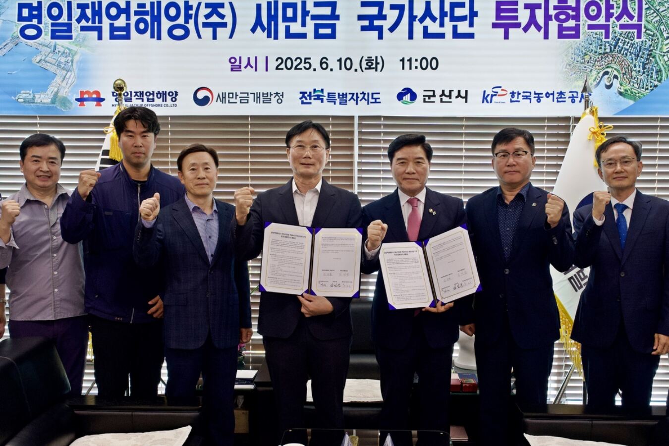 명일잭업해양은 10일 새만금개발청, 전북도, 군산시, 한국농어촌공사와 ‘해상 작업용 잭업바지선 및 해양 기자재 생산시설’ 건립을 위한 투자협약(MOU)을 체결했다. 협약식에는 김문용 명일잭업해양 대표이사와 김경안 새만금개발청장, 관계 기관·기업 관계자 등이 참석했다.