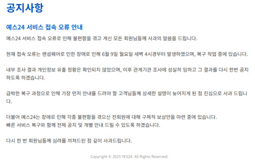 예스24는 “접속 오류로 인해 큰 불편과 심려를 끼쳐 드린 점에 대해 진심으로 사과의 말씀 드린다”며 “이번 접속 오류는 랜섬웨어로 인한 장애로 9일 오전 4시쯤 발생했으며, 예스24는 사고 발생 직후 보안 강화 조치 및 KISA 등 관계 당국 신고와 함께 사고 원인 분석 및 피해 여부 파악에 최선을 다하고 있다”고 전했다.